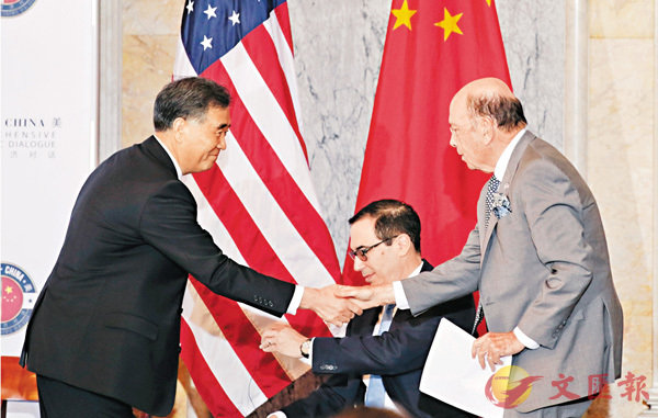 当地时间7月19日,首轮中美全面经济对话在美国华盛顿举行,中国国务院副总理汪洋与美国财长姆努钦、商务部长罗斯共同主持对话。图为汪洋与罗斯握手。/中新社