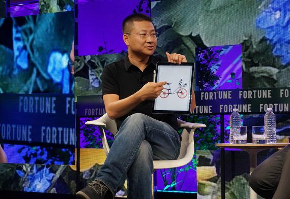 图:摩拜单车行政总裁王晓峰在美国一场发布会上介绍共享单车运营模式 法新社