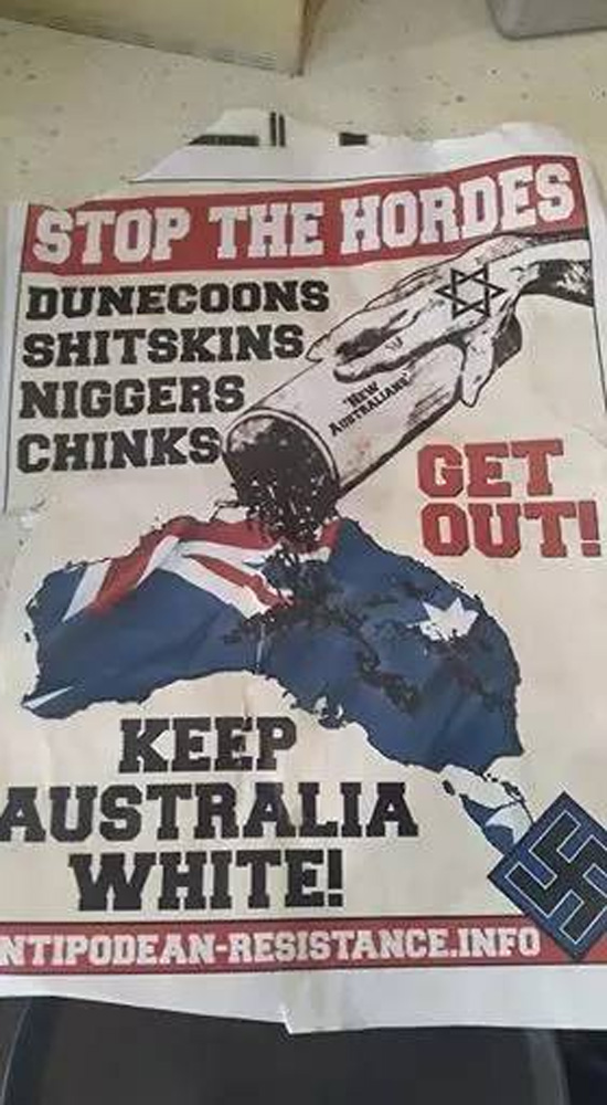 当地学生发现,这些海报背后都印有一个网址,系当地白人独权组织“澳纽抵抗”的网站,该组织崇尚纳粹精神和种族主义,充斥着反人类反社会的内容,宣传白人权力至上、白人统治澳洲的思想。