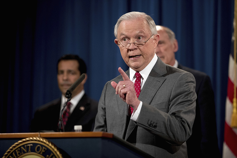 图:美司法部长塞申斯4日召开记者会讨论严打泄密问题/美联社