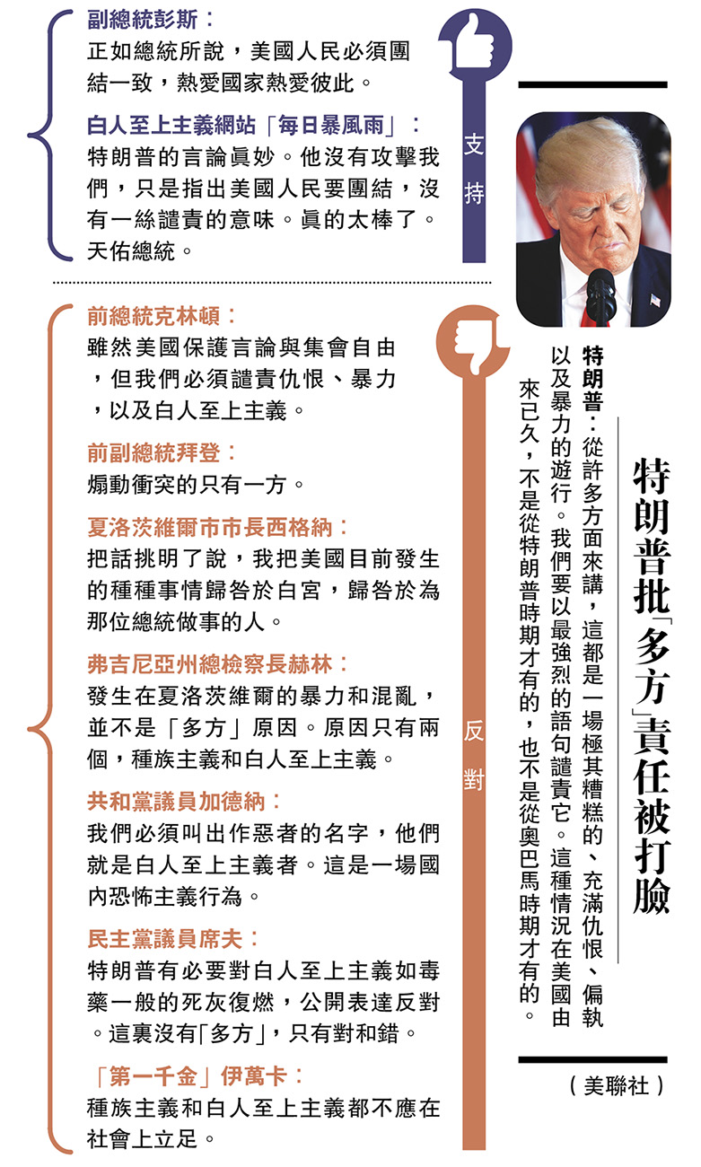 12日下午,特朗普对弗州暴乱事件表示谴责,但在发言中称“多方”在事件中有责任,没有点名批评白人主义者,白宫事后“打圆场”,称总统谴责各种形式的暴力和仇恨行为,这其中“当然包括”白人主义者,特朗普仍受到美国主流民意的批评。《华盛顿邮报》指出,冲突发生时,明明只有一方喊着种族歧视口号,也只有一方认为自己的种族比他人优越,而开车辗过反对者的,也是这一方的人,特朗普的“护短”言论令人不可忍受。