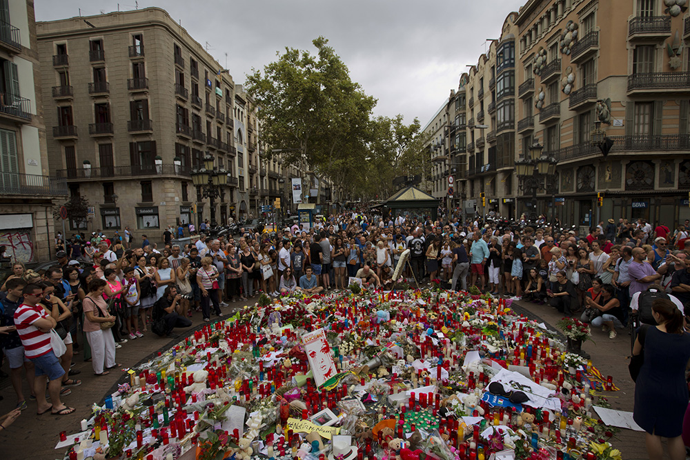 图:巴塞罗那民众19日在兰布拉斯步行街悼念遇难者/美联社