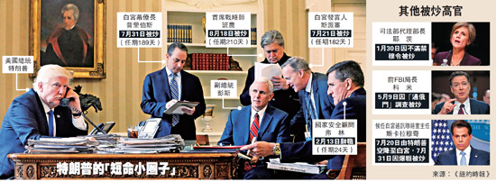 截至19日,特朗普的就职时的“小圈子”已全数离开白宫。不过,关于班农究竟是主动离开还是被扫地出门,却是说法不一。多名白宫官员透露,特朗普近期对班农的表现越来越感到不满,白宫两周前就已着手开除班农。然而,班农方面反驳称离职是自己的主意,而7日向特朗普递交了辞呈,原计划于本周初宣布,只是因为12日爆发的弗吉尼亚州夏洛茨维尔冲突才被搁置。