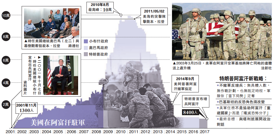 特朗普当天在华府附近迈尔堡军事基地发表上任以来首次黄金时段全国演讲,也是他第一次以三军统帅身份,阐述其政府对阿富汗战争的新战略。