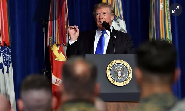 特朗普于美国当地时间周一在弗吉尼亚州阿灵顿的迈尔堡(Fort Myer)发表电视讲话,公布了对阿富汗的新战略,称将扩大美国对阿富汗的军事干预。/图片来自英国《卫报》