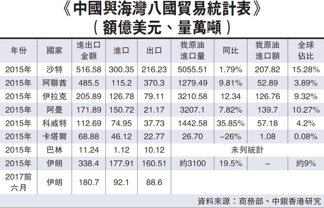 第一,中国与海湾国家在“贸易畅通”上取得显着进展。其一,2015年7月伊朗与中、美、俄、英、法、德六国就限制伊朗发展核武及解除对伊制裁达成伊核全面协议,禁止外国与伊朗贸易往来的“次级制裁”自动解除,中伊经贸合作逐步恢复正常。其二,解读《中国与海湾八国贸易统计表》可见,2015年双边贸易额已高达1911.07亿美元。贸易量特别是原油贸易量有较大升幅。扩大原油贸易的动力由单向转向双向。既有中国扩大进口的动力,也有海湾国家因2014年国际油价暴跌并进入低油价时代,向东寻找亚洲石油市场的压力。目前中国从海湾国家原油进口额在中国全球原油进口额中的占比超过50%。其三,今年贸易回暖,今年前6个月中国与伊朗的贸易额达180.7亿美元,同比增长30.8%。