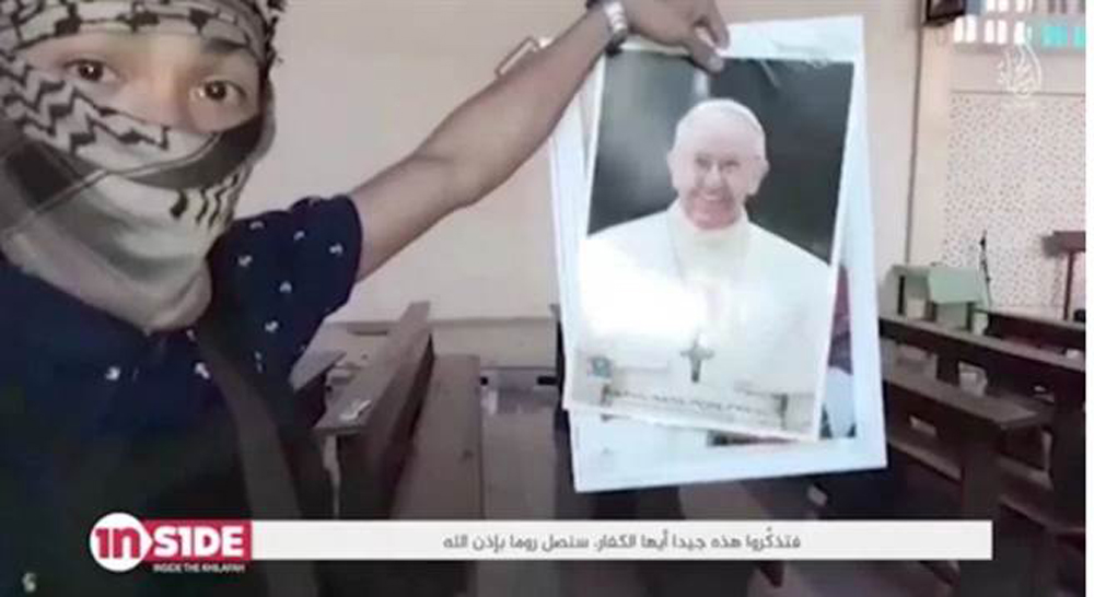 图:ISIS分子在影片中手举教皇方济各照片\网上图片