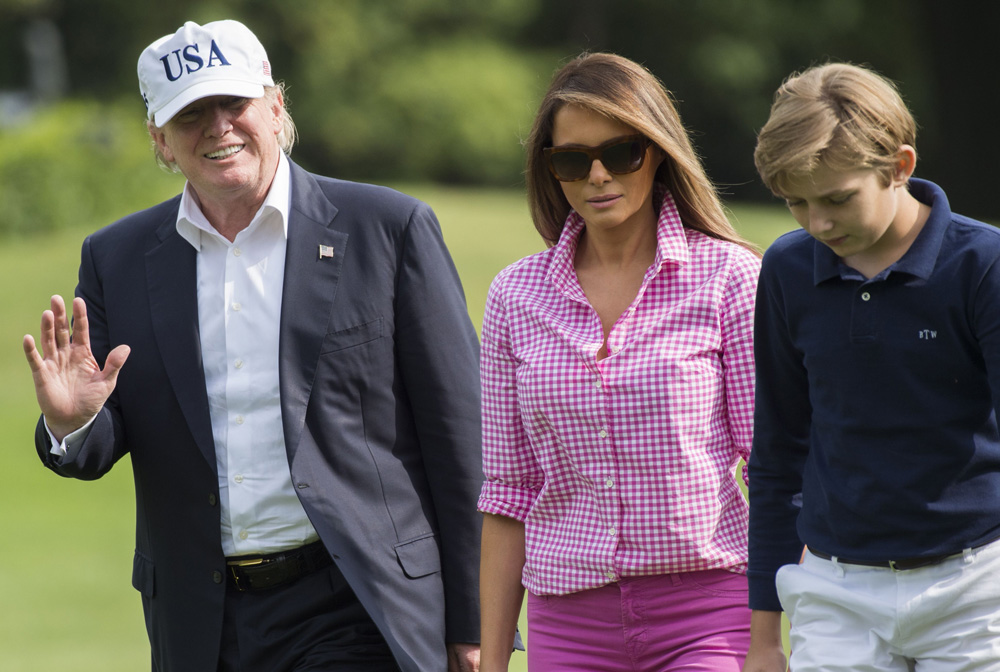 图:美国总统特朗普、第一夫人梅拉尼娅和儿子拜伦(从左至右)27日从戴维营返回白宫\法新社