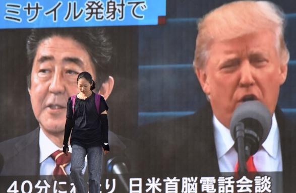 图:一名日本女子29日经过东京一个大屏幕,背后播放有关日本首相安倍晋三与美国总统特朗普通电话的新闻法新社