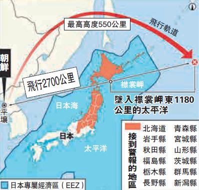 【大公报讯】综合美联社、路透社、《纽约时报》报道:朝鲜29日清晨发射导弹飞越日本上空,这是朝鲜自2009年来首次射导弹飞越美国亲密盟友日本的本土上空,引发区域不安。专家表示,朝鲜领导人金正恩是想藉由这次试射,主要让外界相信朝鲜扬言导弹攻打关岛并非空话,要把美国逼回谈判桌上。
