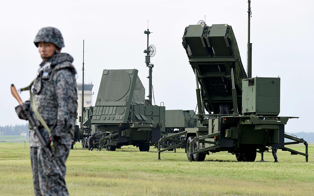 图:日本自卫队员站在陆基弹道导弹防卫系统爱国者3号前/法新社 来源:大公报