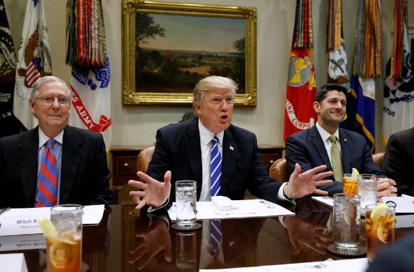 图:美国总统特朗普(中)与参议院多数党领袖麦康奈尔(左)、众议院议长瑞安\美联社