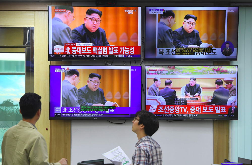 图:韩国气象局官员在3日观看朝鲜第六次核试新闻\法新社