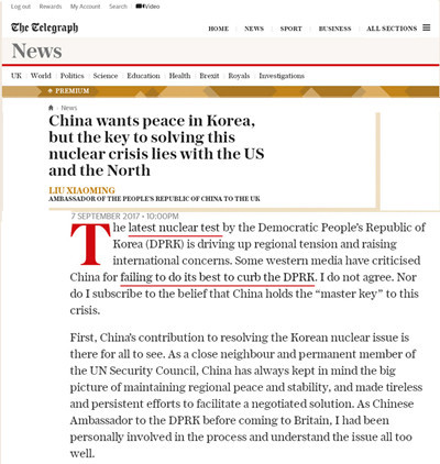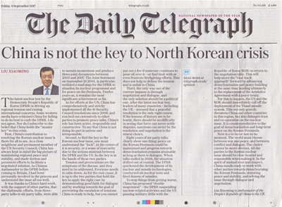 2017年9月8日,英国主流大报《每日电讯报》纸质版刊登刘晓明大使题为《解决朝核危机的钥匙不在中国手中》的署名文章。同日,该报网络版以《中国主张半岛和平,但解决朝核危机的钥匙在美国和朝鲜手中》为题同步刊登上述文章。全文如下:
