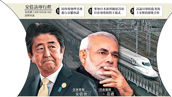 安倍设定了在五年内向印度增加两倍投资的目标,并承诺资助350亿美元(约2739亿港元)用于实施印度各项基础设施计划。目前,日本已成为印度的第三大投资国。