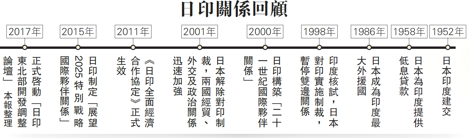 日本已帮助印度进行多项基础设施建设,例如为印度德里地铁第一期工程提供技术支持,提供新干线技术协助印度打造孟买─艾哈迈德巴德高铁,以及包括“德里孟买工业走廊”在内的其他大型项目。