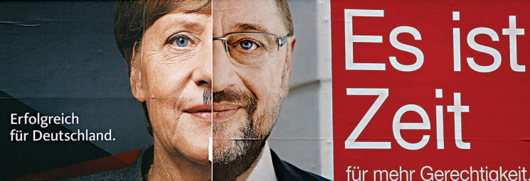 默克尔(左)与主要竞争对手社民党舒尔茨的海报,图中默克尔被涂上“胡子” 路透社