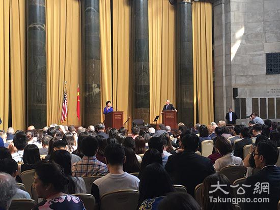 正在美国访问的中国副总理刘延东,纽约当地时间26日出席了一系列的中美人文交流活动,为即将举行的首轮中美社会和人文高级别对话预热。图为刘延东副总理(左)在哥伦比亚大学举办的中美大学校长与智库论坛上发言并回答听众提问(黄晓敏摄)