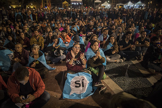 图:选民1日在巴塞罗那主广场等待公投结果\美联社