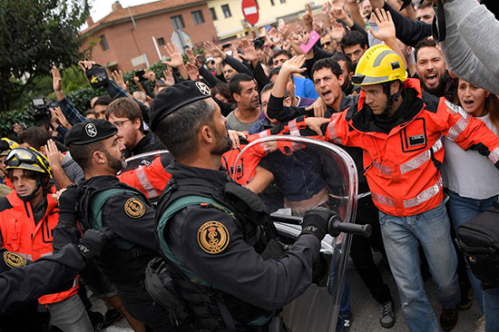 图:加泰消防员(右)1日与西班牙警员对峙\法新社