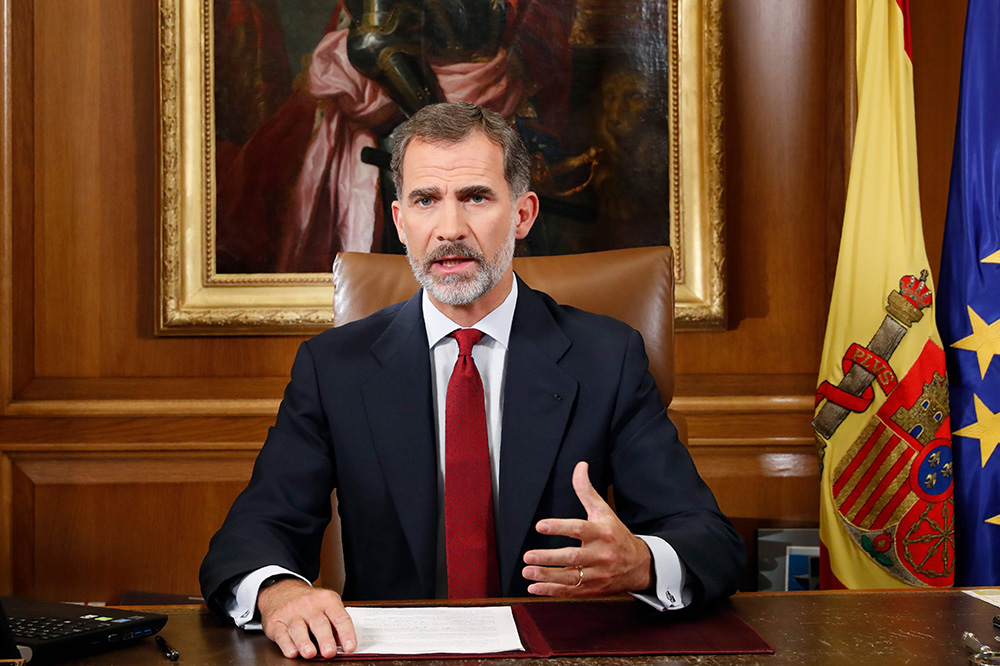 在电视转播的全国演说中,费利佩六世以坚定语气打破先前对此事的谨慎态度,表示西班牙正遭遇民主歷史中最严峻的时刻,加泰政府一再故意违反宪法及其自治章程,独立公投暴露出其对国家权力“不可接受的不忠”,打破了法治国家的民主准则,破坏加泰经济和社会稳定,导致社会分裂。