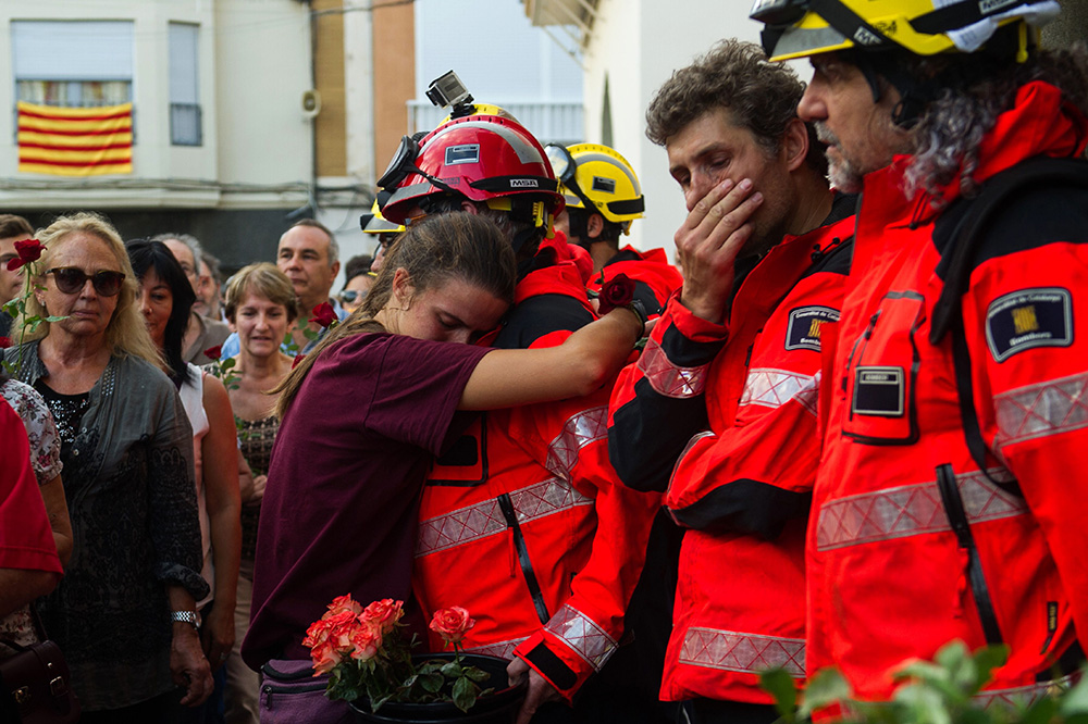图:加泰罗尼亚3日大罢工,一名女子与消防员无言相拥/法新社