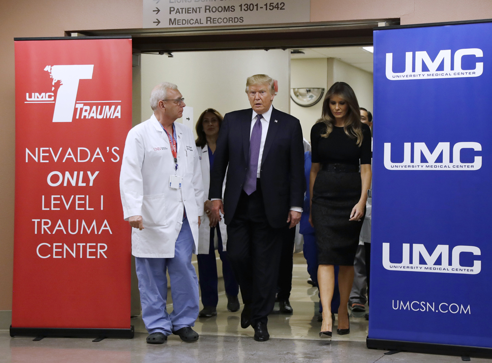 特朗普夫妇首先前往收治伤员的南内华达大学医疗中心慰问受害者。在被一名记者问及枪支暴力问题时,特朗普说“我们今天不谈这个”,只称枪手是“病态”和“疯狂”的人。随后,特朗普夫妇前往拉斯维加斯大都会警察局与警方座谈。