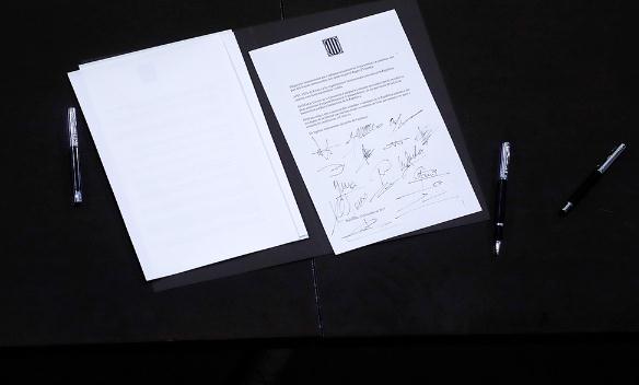 图:普伊格德蒙特与自治区其他政治人物共同签署了一份宣布加泰独立的文件,但并不清楚文件是否具法律价值路透社