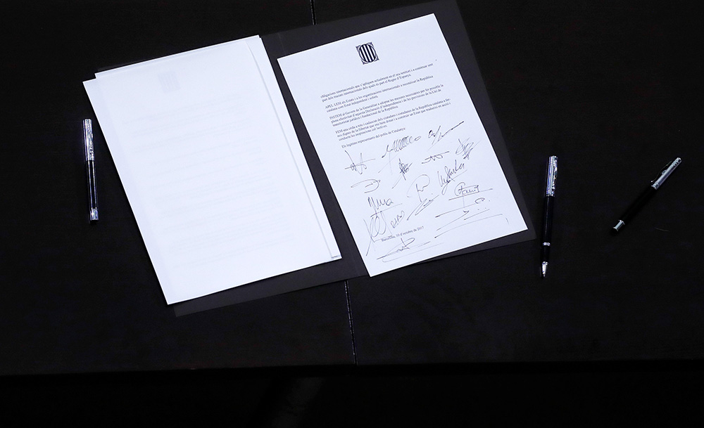 图:普伊格德蒙特与自治区其他政治人物共同签署了一份宣布加泰独立的文件,但并不清楚文件是否具法律价值 路透社