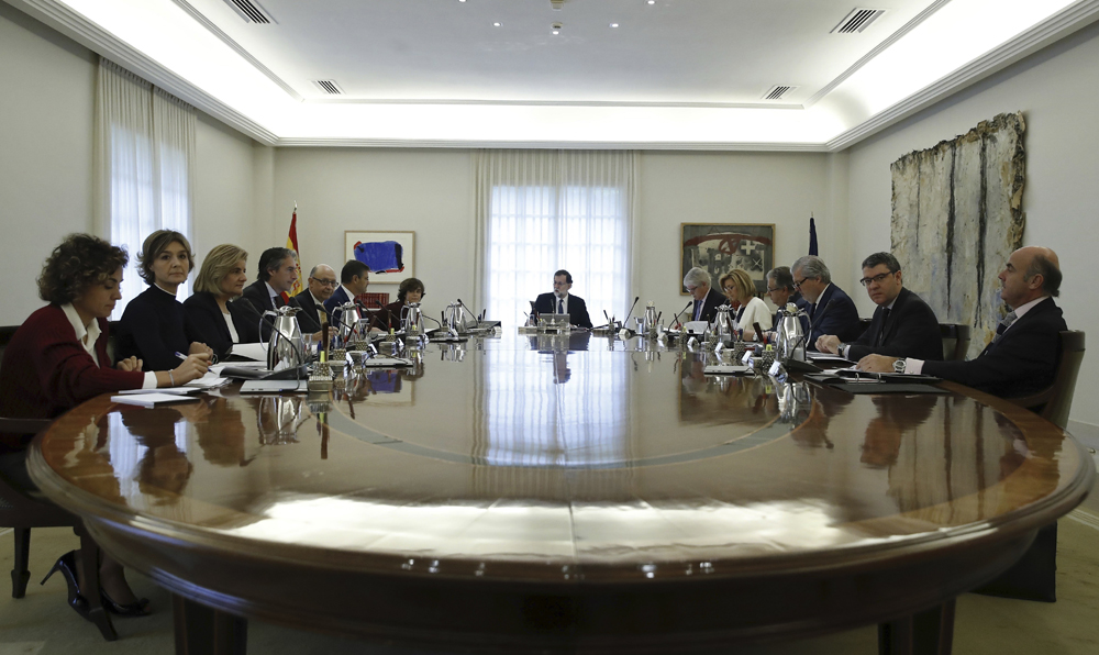 图:当地时间21日,西班牙首相拉霍伊(中)于马德里组织内阁会议\美联社