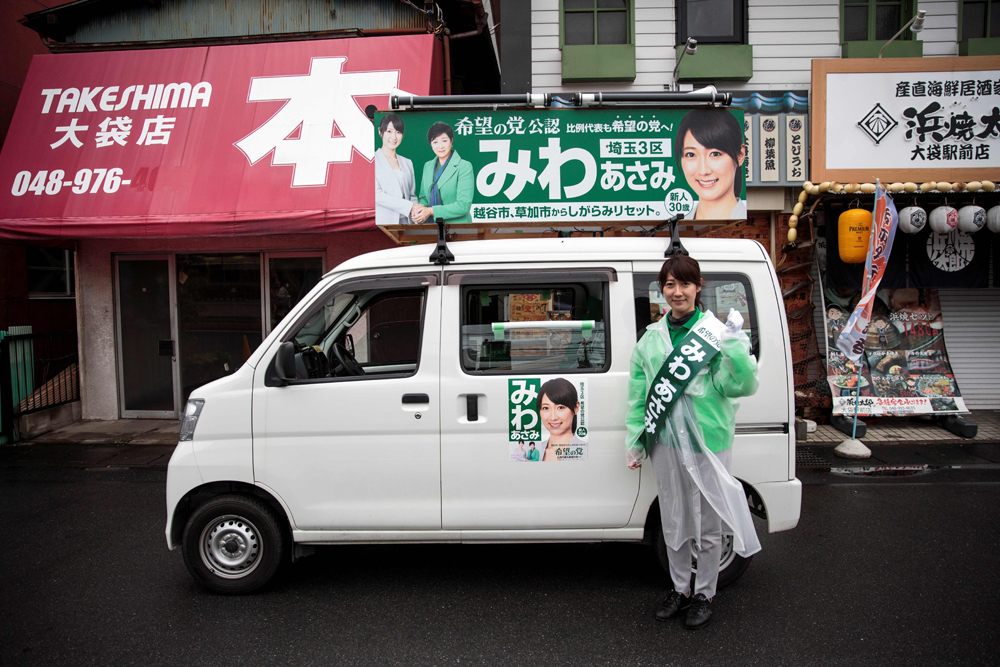 21日,她在埼玉县街头向潜在选民争取选票。虽然天空下着毛毛细雨,但她还是不停向路过的选民挥手鞠躬。