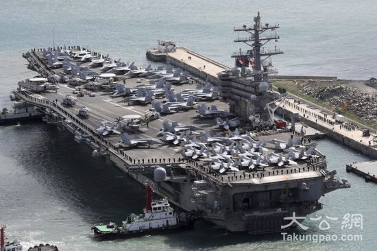 图:21日,结束军演的美军“里根”号驶进韩国釜山港\美联社