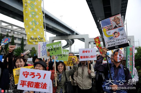 资料图:当地时间2016年5月3日,日本东京,日本“和平宪法”迎来实施69周年之际,民众集会表达支持,抗议安倍政府篡改宪法。图片来源:东方IC