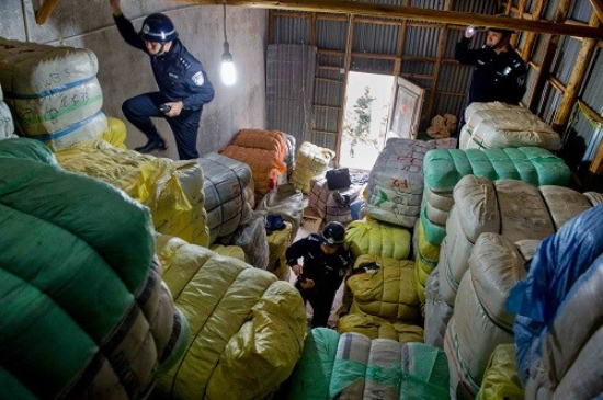 资料图片:汕头海关和陆丰公安、边防、打私、工商等部门在碣石镇捣毁一个走私进口旧服装储存窝点(3月3日摄)。新华社发