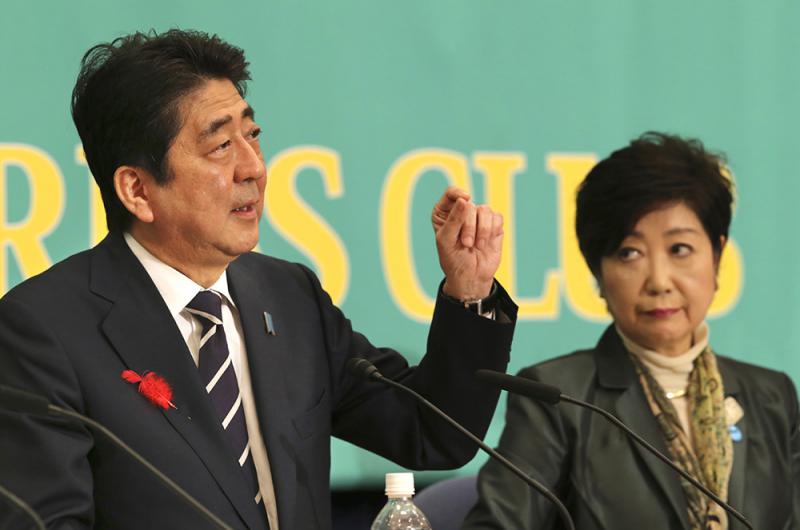 图:安倍晋三(左)与小池百合子10月8日参加选前辩论\美联社