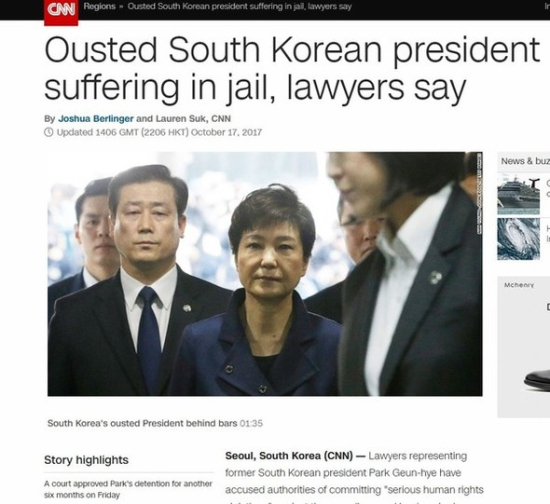 据美国有线电视新闻网(CNN)报道,当地时间10月17日,该媒体从朴槿惠的国际法务组MH集团手中获得了“关于朴槿惠人权状况报告书”的独家草案。在该文件中,MH集团主张,“朴槿惠生活在又脏又冷的牢房里,在夜里也一直开着灯,无法入睡”。文件中还主张,“朴槿惠因下腰痛、膝盖及肩膀部位的骨关节炎、罕见的肾上腺素异常以及营养失调等疾病正在遭受痛苦,但没有证据证明她接受了适当的治疗”。
