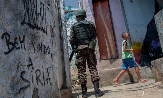 图:一名巴西军警在罗西尼亚贫民区维安 网上图片