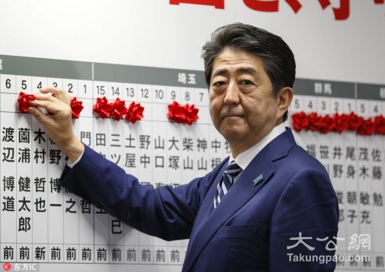 当地时间2017年10月22日,据外媒消息,日本大选出口民调显示,日本首相安倍晋三执政联盟在众议院选举中获得多数票而取胜,安倍晋三预计将连任日本首相。图片来源:东方IC