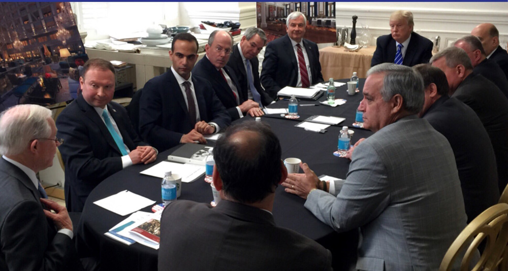 图:特朗普去年三月公布竞选团队会议照片,帕帕佐普洛斯(上排左三)在座 美联社