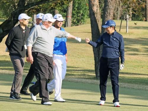 5日,特朗普和安倍晋三在2020年东京奥运会高尔夫比赛场地、日本埼玉县川越市霞关乡村俱乐部共进午餐。随后,两人换上高尔夫球衣,与全球排名第4的高日本尔夫球职业选手松山英树在场一起挥杆,借此增进与特朗普的个人信赖关系。期间两人在绣着“Make alliance even greater”(译为“让美日同盟更伟大”)字样的帽子上签名,松山英树也在帽子上签了名,这也被视为安倍送给特朗普的纪念品之一。