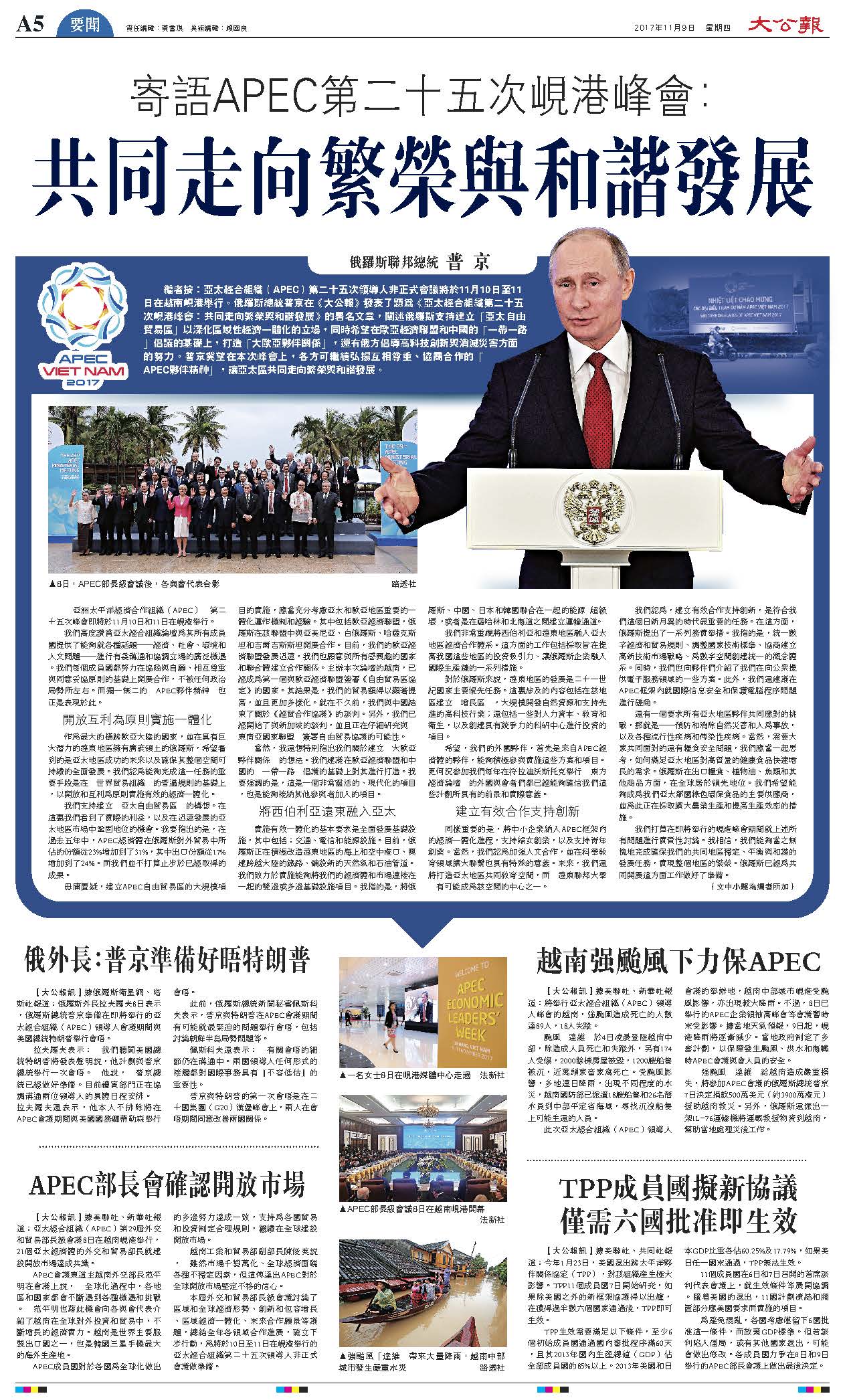 编者按:亚太经合组织(APEC)第二十五次领导人非正式会议将于11月10日至11日在越南岘港举行。俄罗斯总统普京在《大公报》发表了题为《亚太经合组织第二十五次岘港峰会:共同走向繁荣与和谐发展》的署名文章,阐述俄罗斯支持建立“亚太自由贸易区”以深化区域性经济一体化的立场,同时希望在欧亚经济联盟和中国的“一带一路”倡议的基础上,打造“大欧亚伙伴关系”,还有俄方倡导高科技创新与消灭灾害方面的努力。普京冀望在本次峰会上,各方可继续弘扬互相尊重、协商合作的“APEC伙伴精神”,让亚太区共同走向繁荣与和谐发展。
