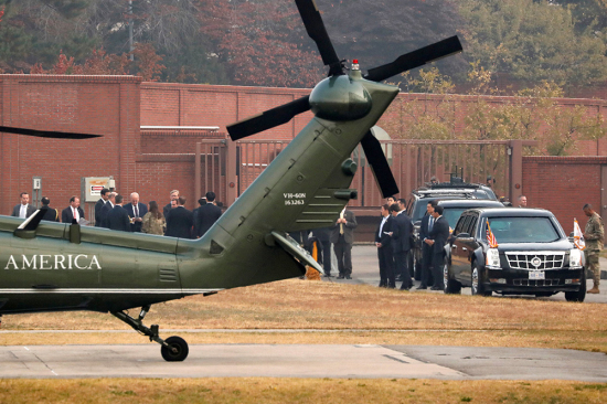 早晨7时许,特朗普一行搭乘直升机从美军驻首尔龙山基地出发,经25分钟的飞行,在京畿道坡州附近遭遇浓雾,飞机因能见度不足难以着陆,此时他们距目的地只剩几分钟的路程。