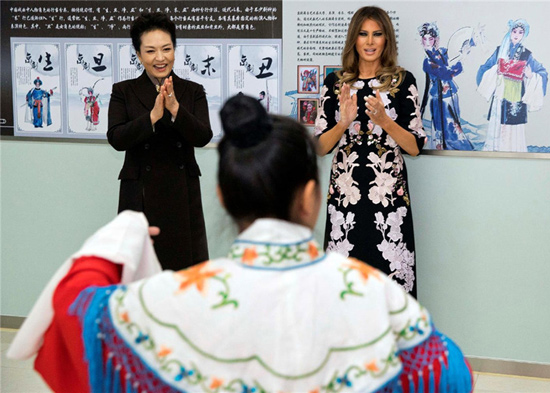 新华社北京11月9日电(记者 白洁)国家主席习近平夫人彭丽媛9日上午与美国总统特朗普夫人梅拉尼娅女士共同参观了北京市板厂小学。
