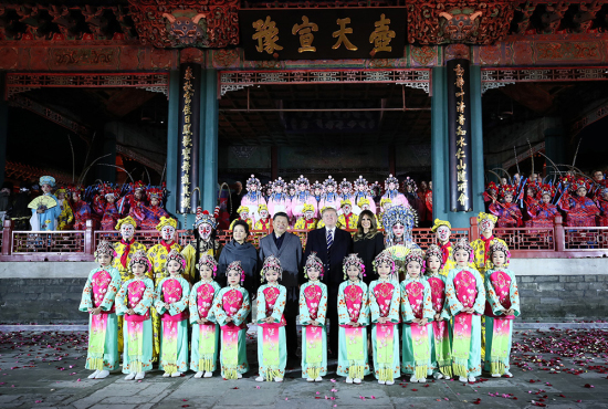 图:8日,中国国家主席习近平和夫人彭丽媛陪同美国总统特朗普和夫人梅拉尼娅欣赏京剧表演后同演员们合影\新华社