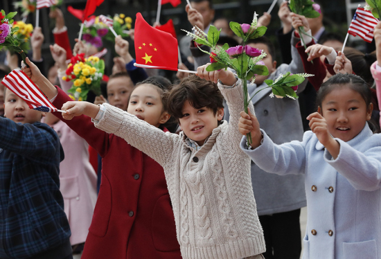 图:中外儿童9日在北京人民大会堂东门外广场上欢迎美国总统特朗普到来\中新社