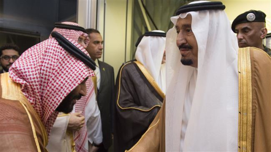 沙特皇宫发布的照片显示,2017年8月23日,沙特国王萨勒曼度假回国时,在机场受到王储穆罕默德的欢迎。