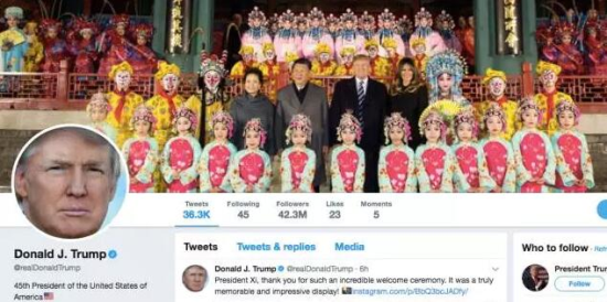 相较而言,特朗普的发言显得更加随性。他难掩对习主席本人和对中国的喜爱。在抵华第一天,就将自己的推特封面换成了与习近平夫妇以及京剧演员们的合照;并在到访之前,连发多条推特表示期待这次会晤;11月9日的发言中,他还透露,11月8日在故宫原定25分钟的晚宴被延长到至少2个小时,因为聊得实在太愉悦,“我珍惜在这里的每一分钟”。