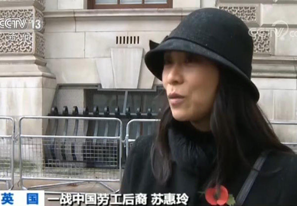 一战中国劳工后裔 苏惠玲:整个英国都没有一座纪念一战中国劳工的纪念碑,今天的献花活动让我感到荣幸,这是一战中国劳工在英国首次被正式纪念,英国华人社团正计划为一战华人劳工筹建永久纪念碑,我希望这个计划能够尽早实现。