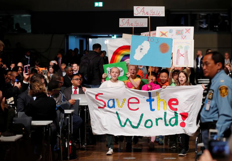 图:联国气候大会11月6日临开幕时,孩童在会场内呼吁“拯救世界”/路透社