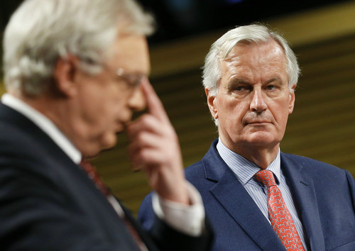 资料图片:11月10日,在位于比利时布鲁塞尔的欧盟总部,欧盟首席谈判代表米歇尔·巴尼耶(右)与英国“脱欧”事务大臣戴维·戴维斯出席联合记者会。新华社记者 叶平凡 摄